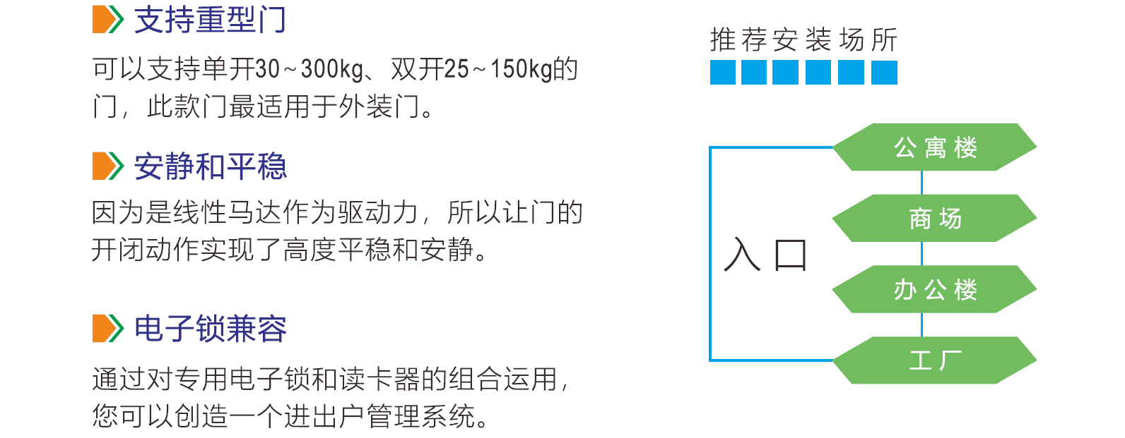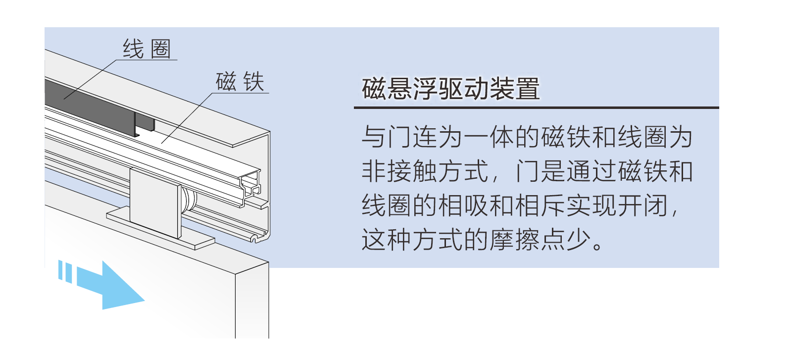 智能磁懸浮門符合家用自動門及殘障門標準,此標準是普通商業自動門機無法達到的。安全、靜音、斷電操作、助動等功能,構成了家用自動門典型的特征噪音小于40分貝,回彈力小于10n以下。