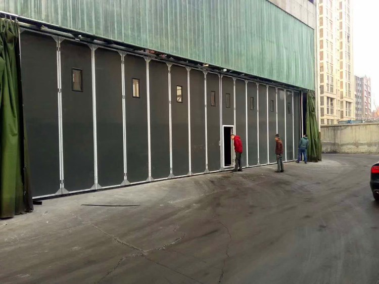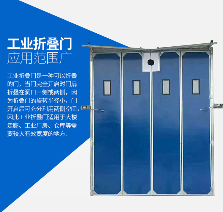折疊門主要由門框、門扇、傳動部件、轉臂部件、傳動桿、定向裝置等組成。該門型均可安裝于室內和室外。每樘門有四個門扇,邊門扇、中門扇各兩扇。邊門扇一邊的邊框與中門扇之間由鉸鏈連接,邊門扇另一邊門梃上下端分別裝有上下轉軸,轉軸與門洞兩邊門框上下轉軸座相連接,邊門梃將繞著一邊梃旋轉,同時帶動中門扇一起旋轉至90°,從而使門扇開啟和關閉,電動時,上轉軸端安裝轉臂部件、傳動部件,門框上部中間安裝傳動部件和開門機;